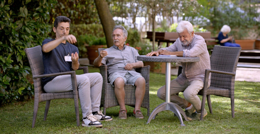 Inoltre, abbiamo beneficiato dell’opportunità di utilizzo di spazi e strumentazioni grazie alla collaborazione de la Quinta Stella, residenza per anziani, che ci ha messo a disposizione la struttura per le riprese del film, e Canale 10 che ci ha concesso l’uso dello studio televisivo, degli uffici e il supporto tecnico. Gli stessi attori hanno accettato di lavorare ai minimi o a rimborso delle spese, sposando il progetto nella sua essenza.